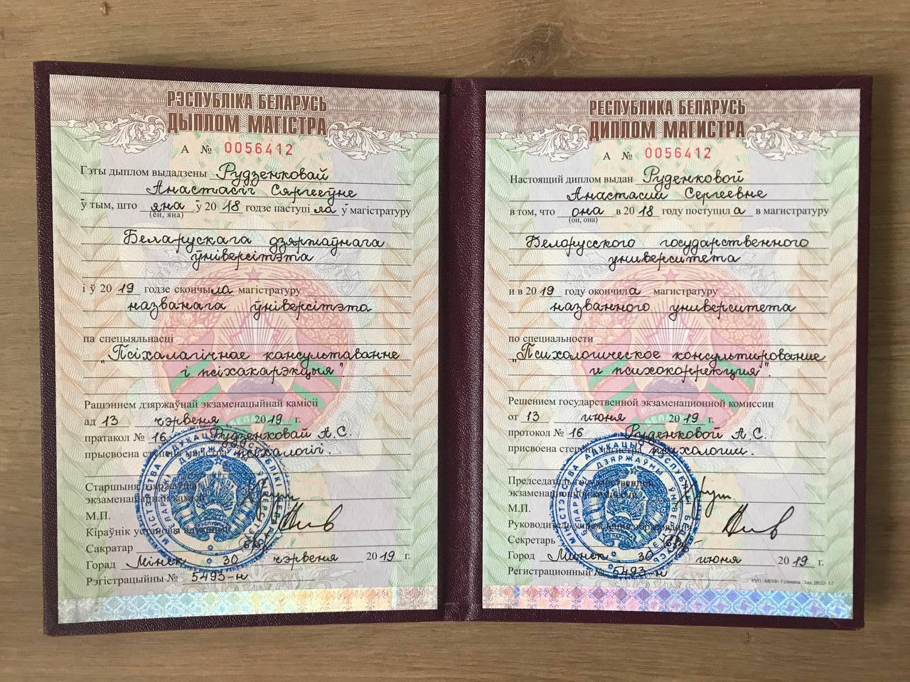 Магистр психологических наук, специальность «Психологическое консультирование и психокоррекция», БГУ, Минск