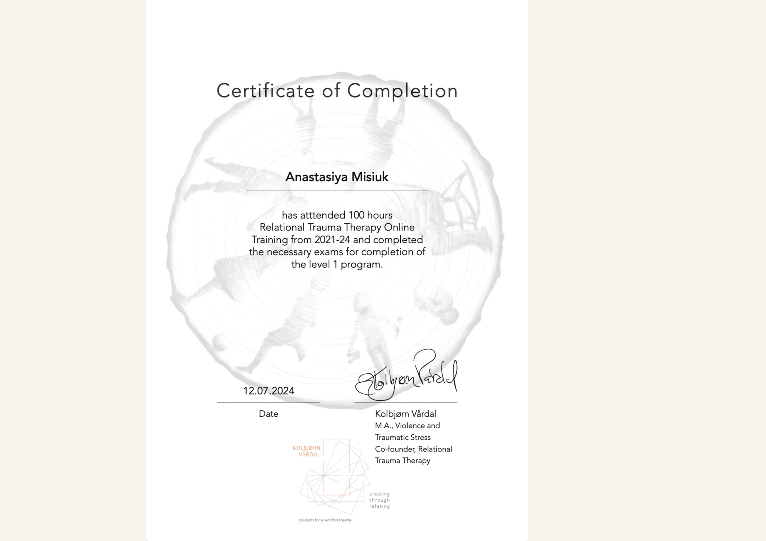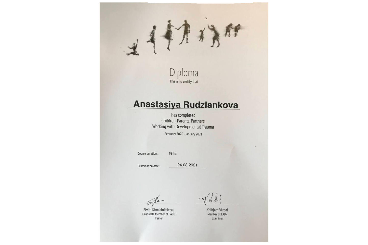 Прошла сертификацию в учебной программе «Терапия травмы отношений. Нейроцентрический подход» у преподавателя из Норвегии Кельберна Ваардааля