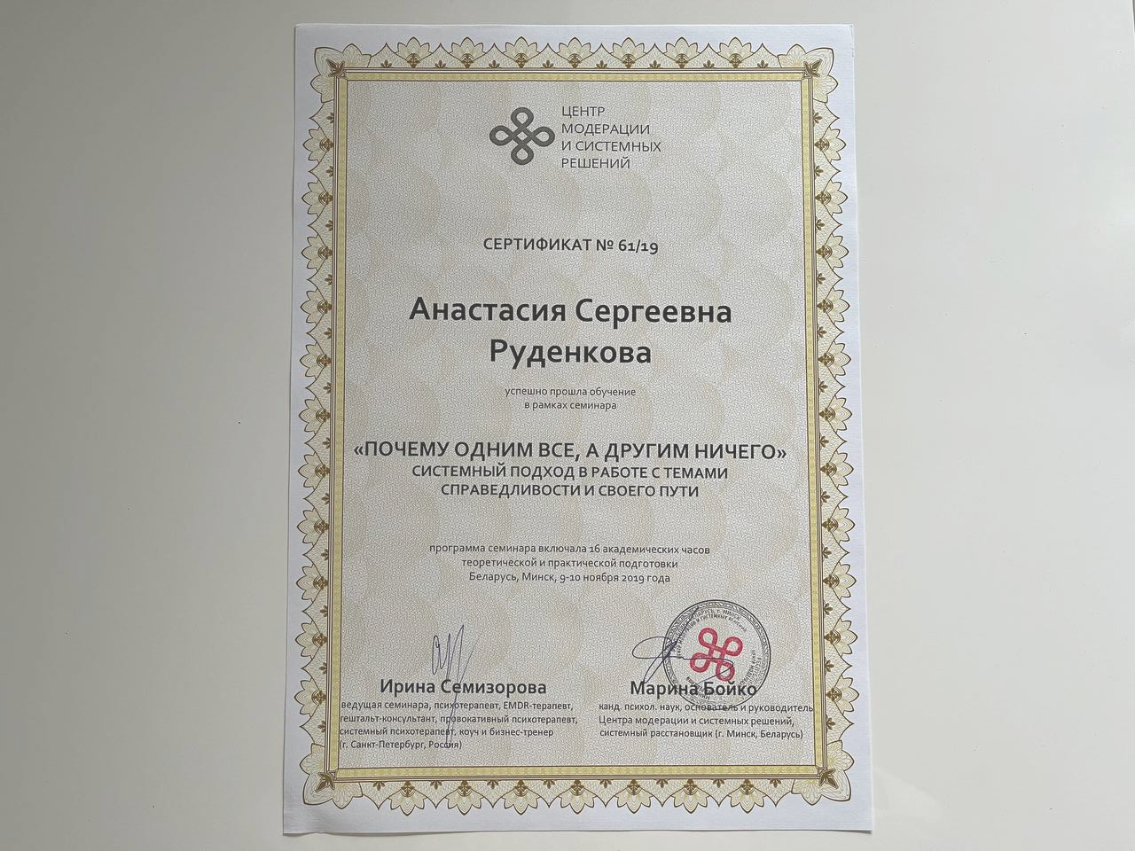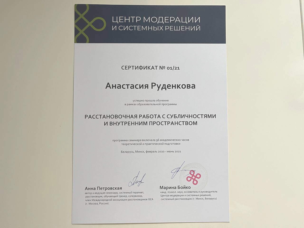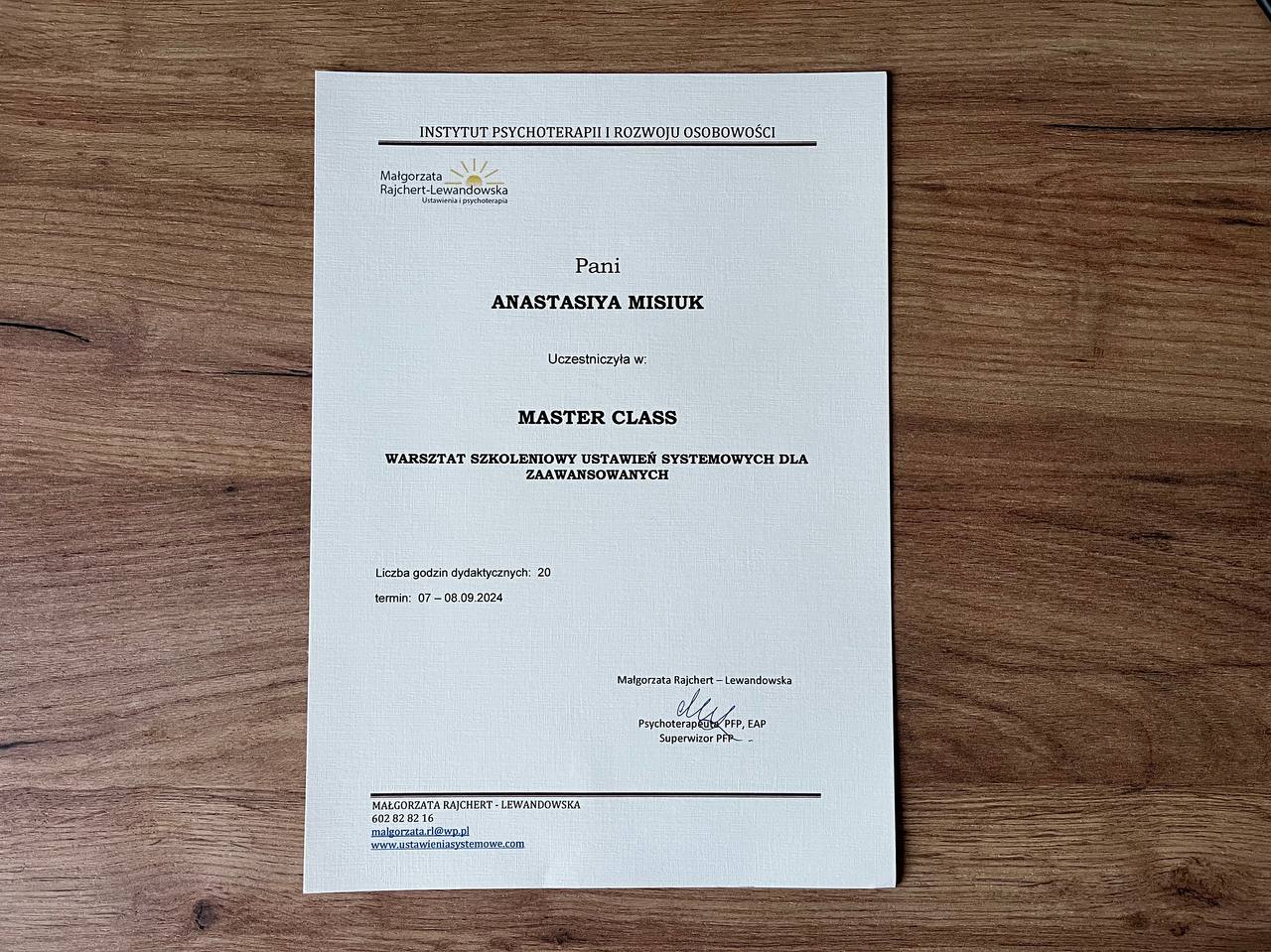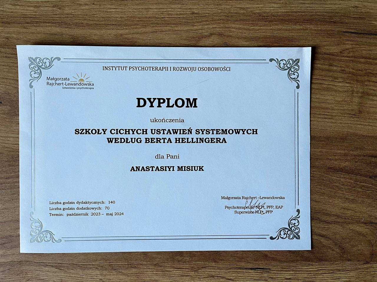 Прошла обучение «Системные расстановки по Берту Хеллингеру» у Малгожаты Райхарт-Левандовской, Варшава